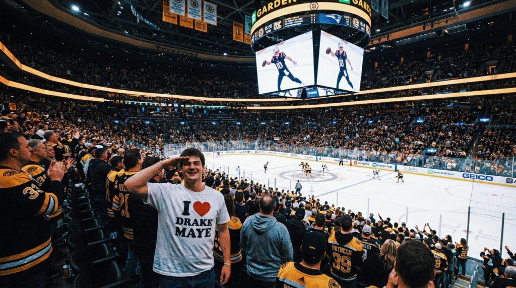 Drake Maye shirt moment at Bruins game and Rob Gronkowski Patriots optimism lit up TD Garden and social feeds in equal measure. The viral clip shows Maye tipping his cap and saluting a fan wearing an I Heart Drake Maye t-shirt on the TD Garden videoboard. Immediately, fans roared because the moment felt genuine and fun. Meanwhile, the arena buzzed as Bruins beat the Dallas Stars 6-3, and cameras kept catching smiling fans in Drake-themed tees.