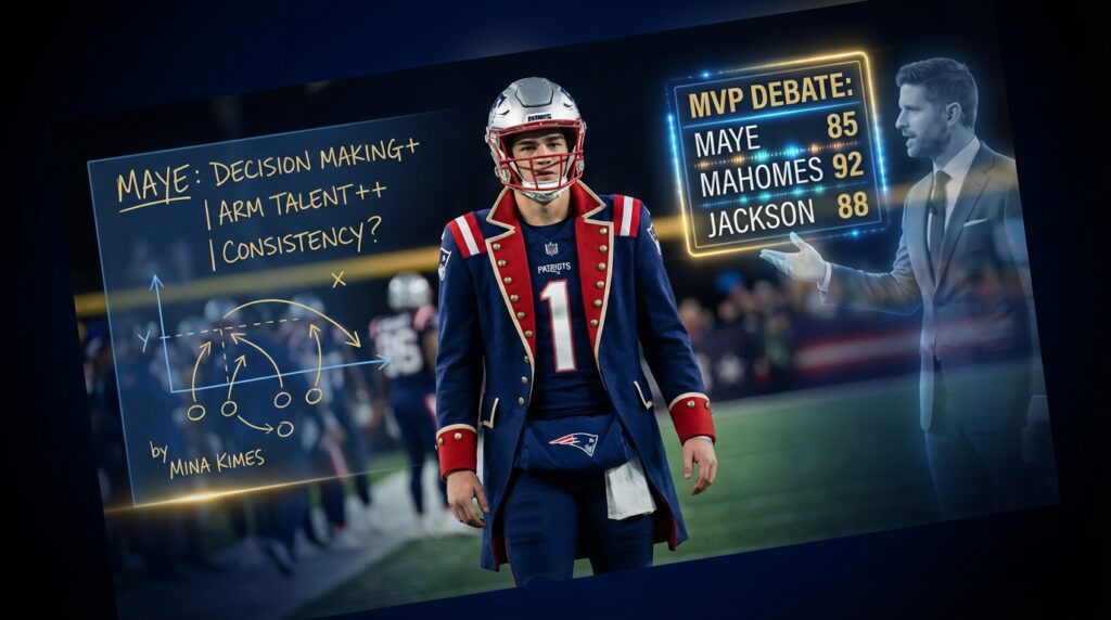 The Drake Maye MVP Debate centers on who added the most measurable value in 2025. Mina Kimes argued for Maye using box score and non-box-score metrics. Dan Orlovsky favored Matthew Stafford on narrative grounds. However Kimes prioritized efficiency, EPA per play, and win probability added. As a result the conversation moved from name recognition to play-level impact. For more on Maye’s case, see this Patriots Report analysis.