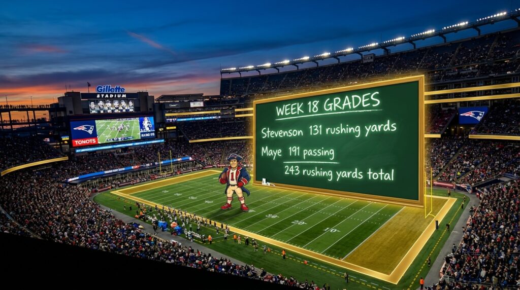 Welcome to our Patriots Week 18 report card, where we break down the 38-10 rout of the Miami Dolphins at Gillette Stadium. That dominant win mattered for playoff positioning, and it showed the Patriots’ offense firing on all cylinders. Fans left energized because New England ran the ball with authority and played disciplined defense.