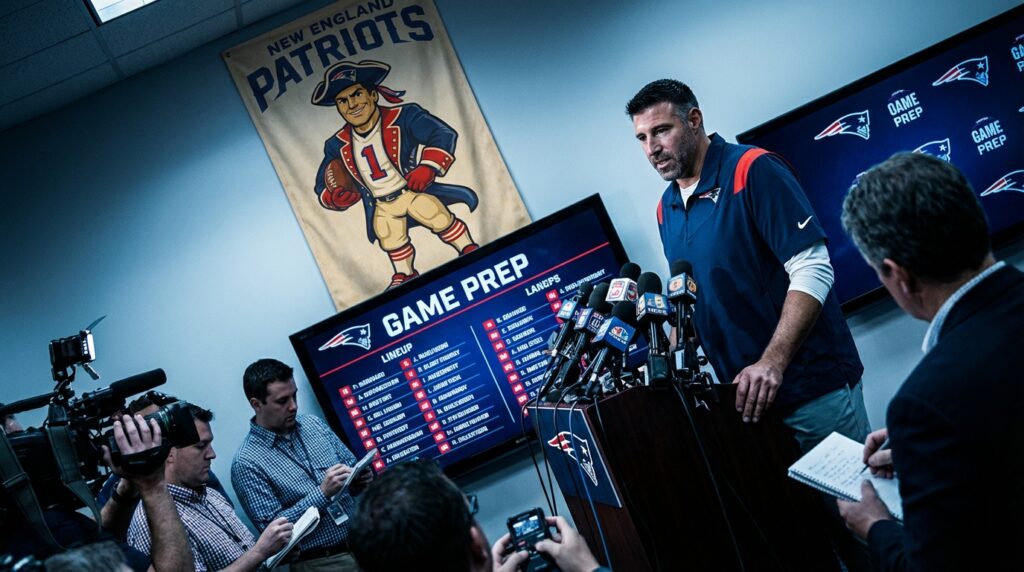 The media room felt electric and clinical at once. Floodlights washed the backdrop in cold white light, and a Patriots banner hung behind Vrabel. Several key players sat nearby, including Marcus Jones and a few injured starters. Meanwhile reporters leaned forward, pens poised, chasing every concise quote.